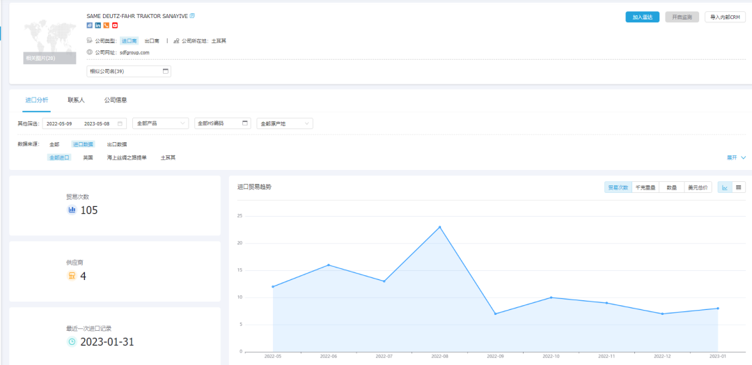 evo真人视讯外贸通能够一键查询和追踪某类产品的全球交易详情,并体现整个供应链的采购供应,最大程度展示整个贸易网的情况,基于交易数据的统计分析,多维度分析行业、产品市场趋势,助力企业洞察市场变化、把握不同市场采购淡旺季,从而准确定位目标市场。