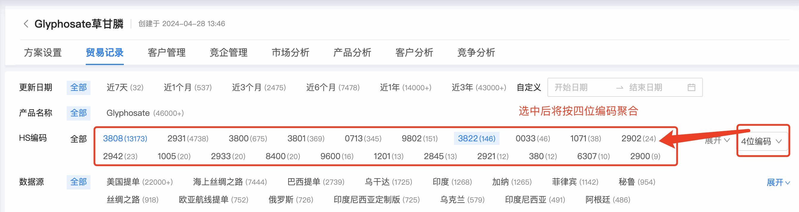 1. evo真人视讯数据通贸易记录的编码筛选,支持按 4 位、 6 位编码位数统计,同时可支持多选。