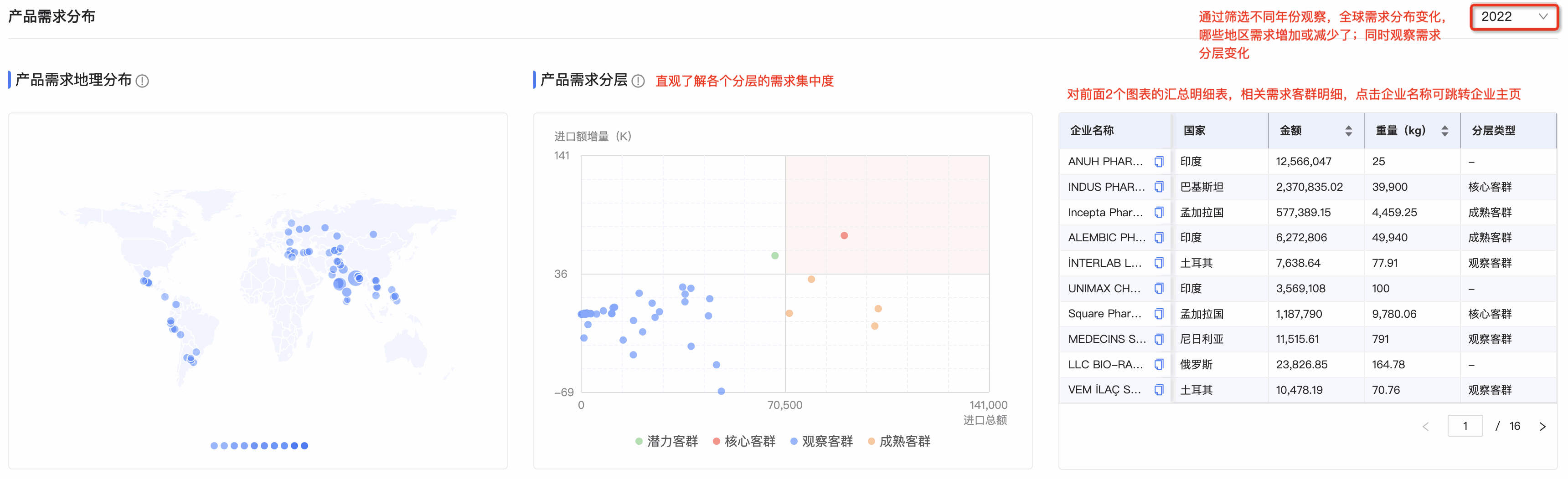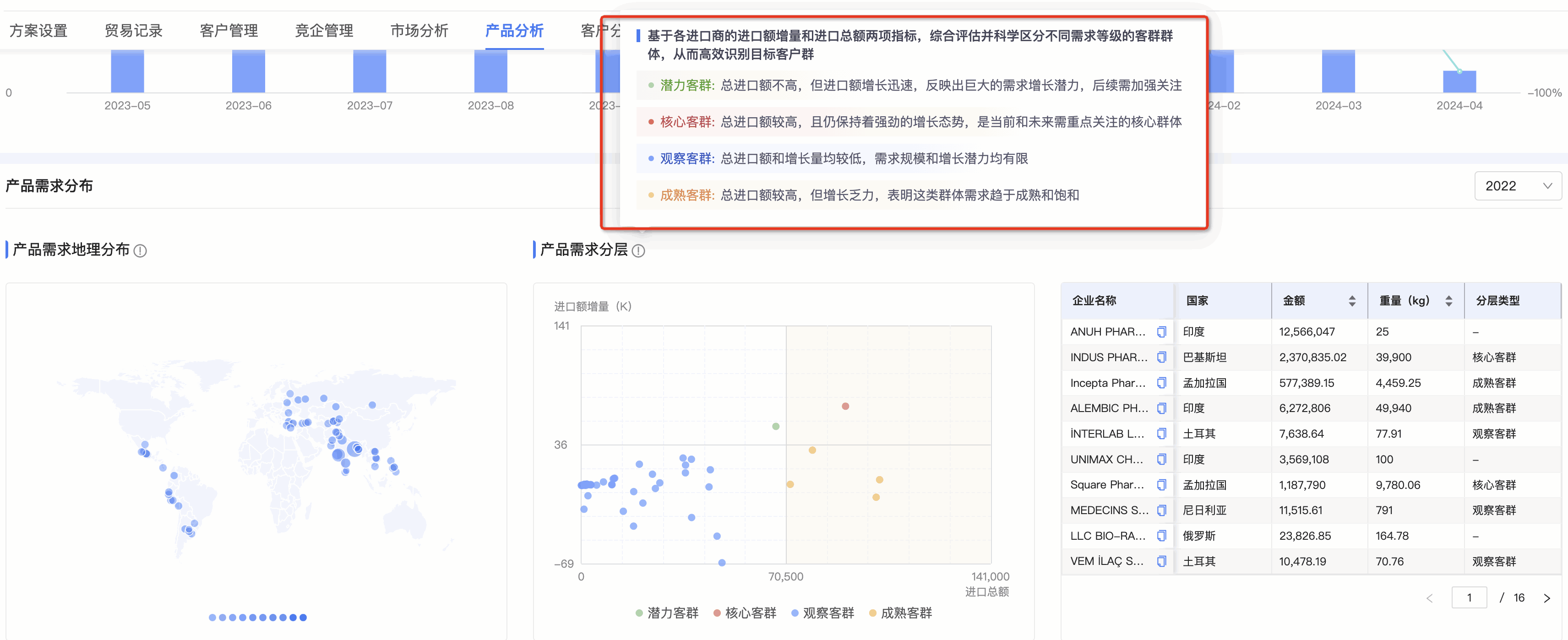 ● 产品需求分层图:evo真人视讯数据通将需求客群按照进口额增量和总额进行分层,划分为潜力、观察、成熟和核心四个层级。分层有助于用户快速锁定目标客户群体。标题旁附需求分层的解读,能让用户更直观、快速理解每个层级的特征,能够更快速的识别目标客群。