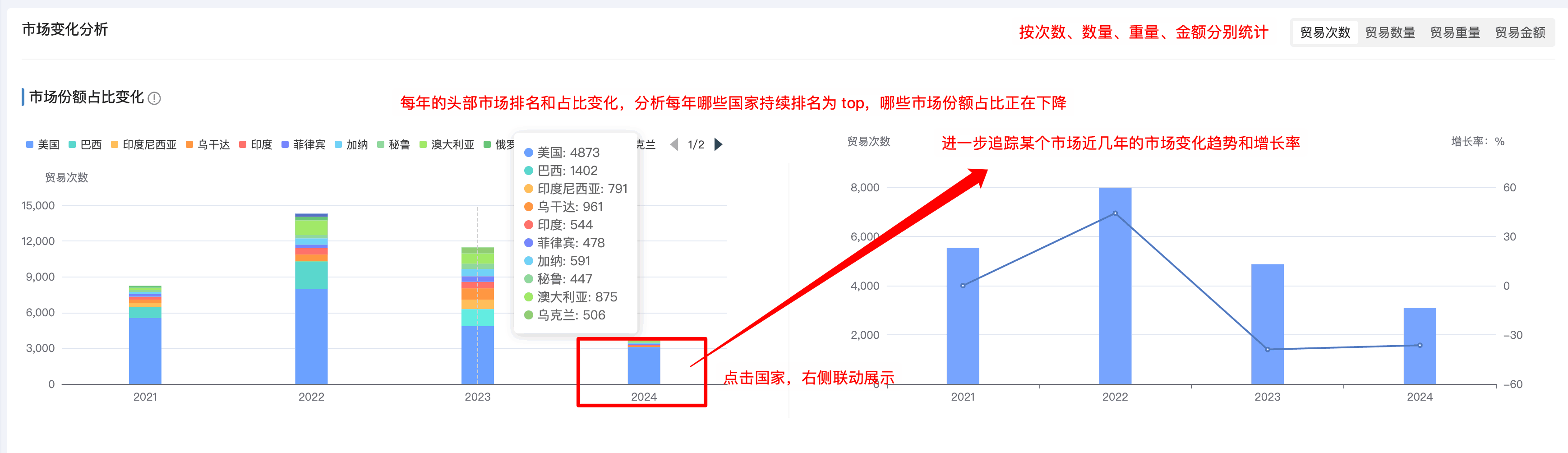 3. evo真人视讯商情洞察竞争分析新增「竞争集中度分析」:基于行业集中度(Concentration Ratio)理论来计算目标产品竞企竞争集中度,出口目标产品前8家最大的企业所占市场份额的总和,是对整个竞争市场结构集中程度的测量指标